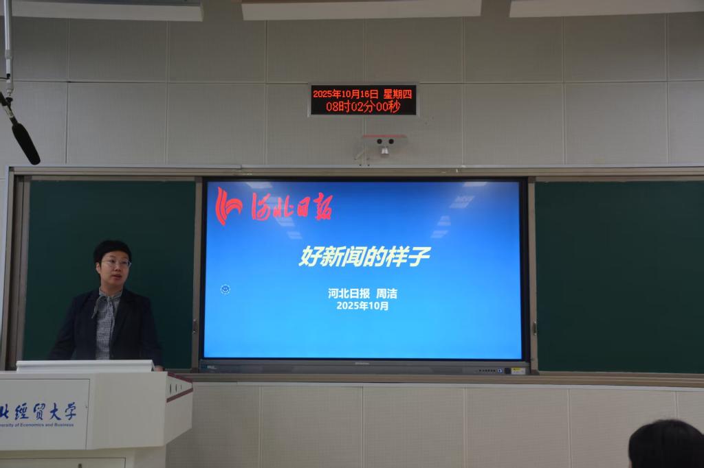 邀请河北日报石家庄分社副社长周洁在B教308教室开展主题为“好新闻的样子”的讲座,新闻传播学专业60余名学生参加。
