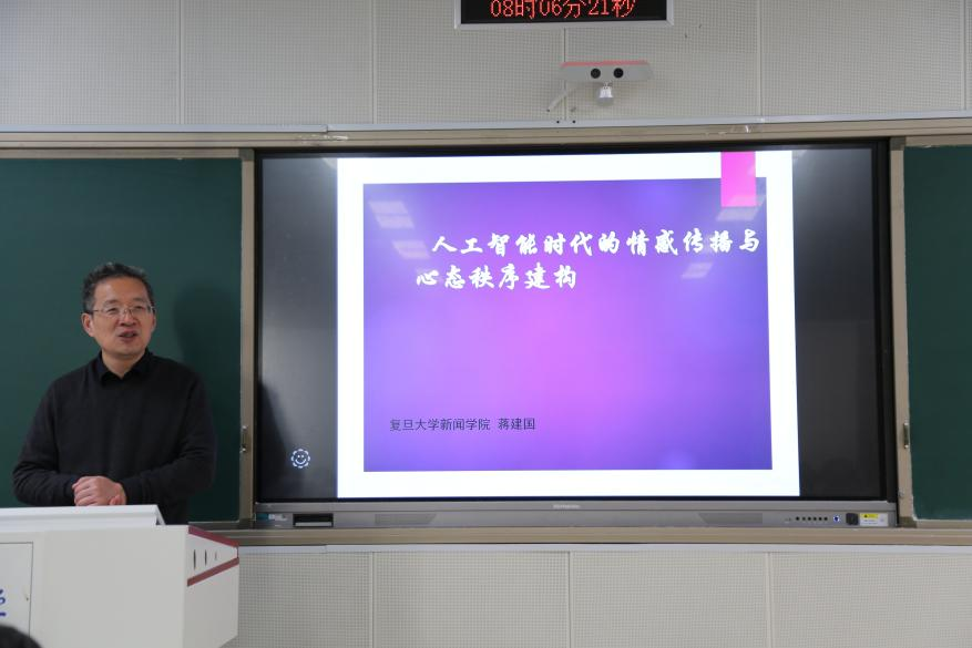 蒋建国教授应邀作题为“人工智能时代的情感传播与社会心态秩序建构”的学术讲座,新闻传播学相关专业师生共60余人参加。