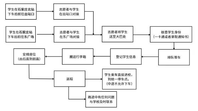 具体内容:新生出站后(到达石家庄站的新生由东广场出站),寻找手持河北经贸大学标志的志愿者,由接新志愿者引导、登记、乘车,每位学生最多带两位家长乘车。
